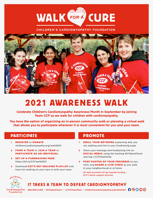 It's time to reconnect for CCF's 7th Annual Walk for a Cure. After a challenging year, we can now safely come together to raise awareness of cardiomyopathy. Join Team CCF during Children's Cardiomyopathy Awareness Month and walk in support of children with cardiomyopathy and their families.