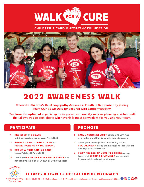 It's time to come together to raise awareness of pediatric cardiomyopathy during Children's Cardiomyopathy Awareness Month. Join Team CCF and other families in walking to defeat cardiomyopathy.